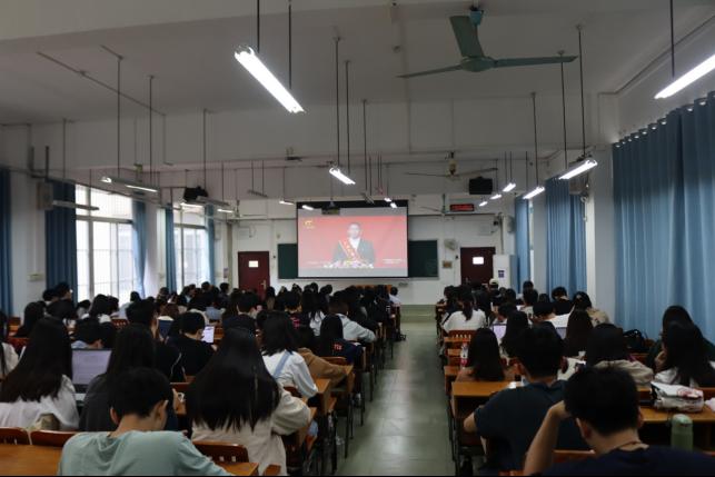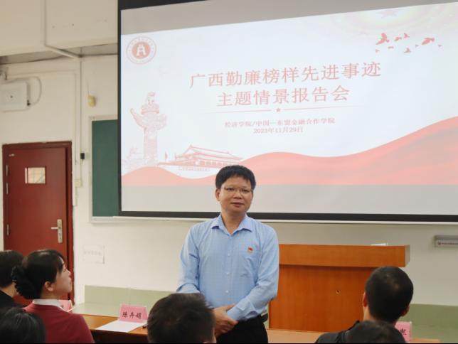 /中国—东盟金融合作学院纪委组织师生党员在3教306教室集中观看广西勤廉榜样先进事迹主题情景报告会实况录像。学院党委书记陆善勇、副书记/纪委书记陈卉娟、副院长梁权熙、副院长杨璞及该时段无课的全体师生党员近180人参加活动。