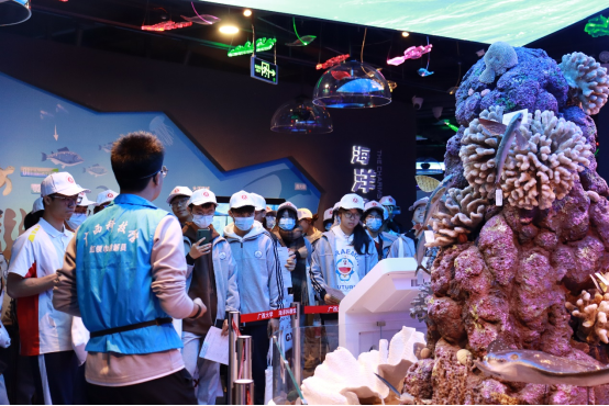 海洋科教馆。馆内多种多样的海洋动物、丰富多彩的鱼类、历史悠久的海洋生物标本、贝类、珊瑚类、矿石类、水晶……吸引了隆安中学同学们驻足观看。