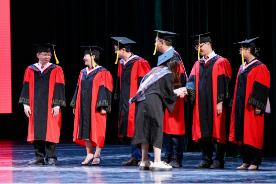 学位评定分委员会主席李光辉院长为2023届毕业生逐一拨穗、授予学位,学院学位评定分委员会各位委员在主席台上肃立见礼、与毕业生一一握手。