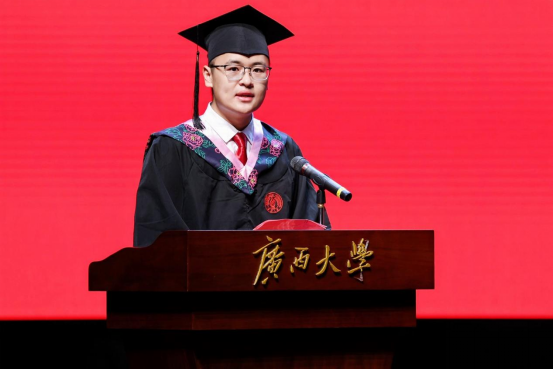 毕业生代表徐震在发言中对学校、师长、同学和父母表达了感恩之情,倡议同学们感恩过往,珍惜当下,开创未来。徐震深情地说:即将离开校园,大家眼神里多了几分坚定、肩背上多了几分责任、脚步下多了几分从容,我们一定要将个人的成长与中华民族实现伟大复兴的中国梦结合起来,踏上建功新时代的征程。