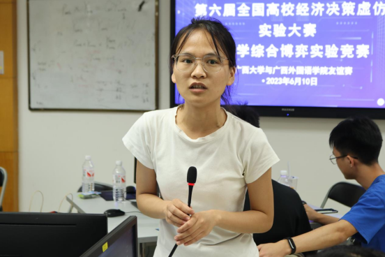 院长助理、经济学系副主任盛玉雪,经济系主任郭南芸召集,广西外国语学院国际经济与贸易系主任孙西楠等四位老师带队参赛,两校共计50余名参赛队员一起度过了一个充实的周六。