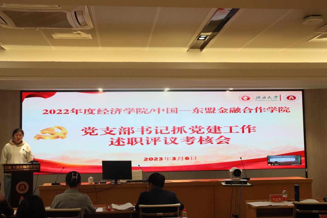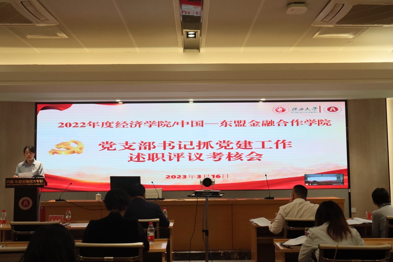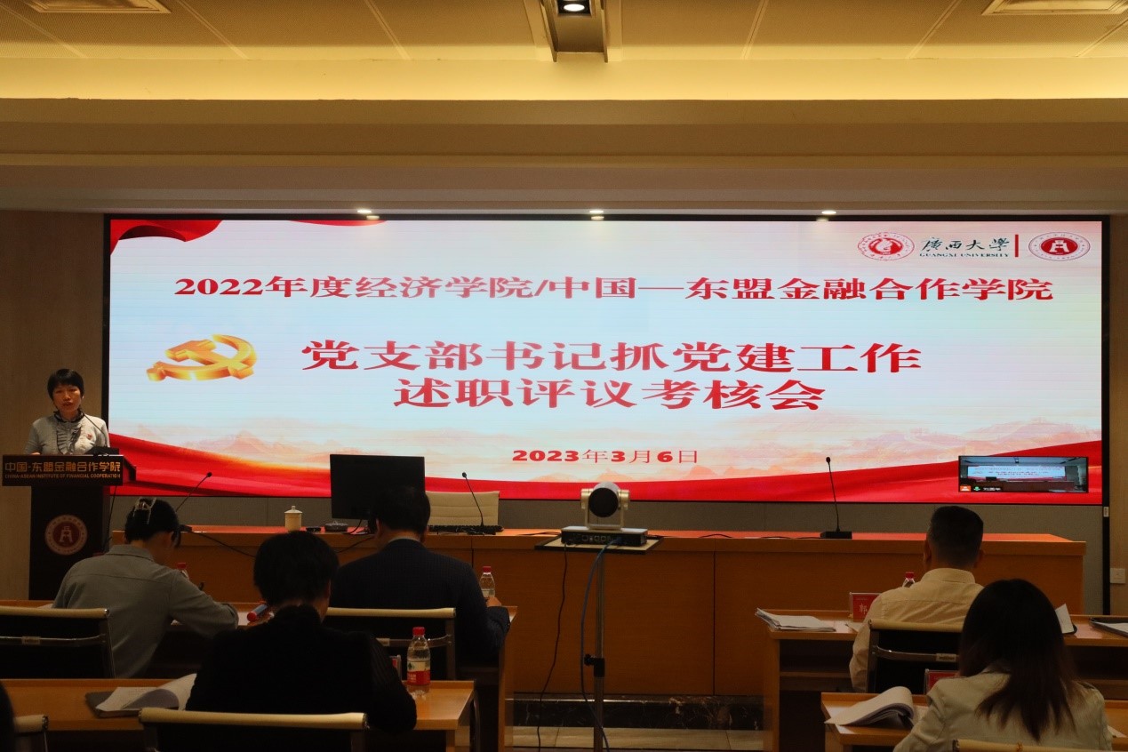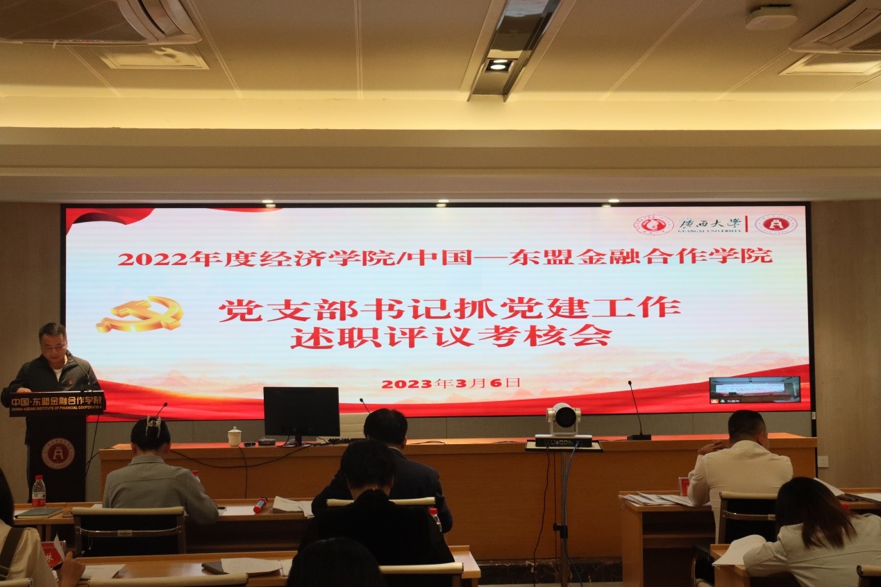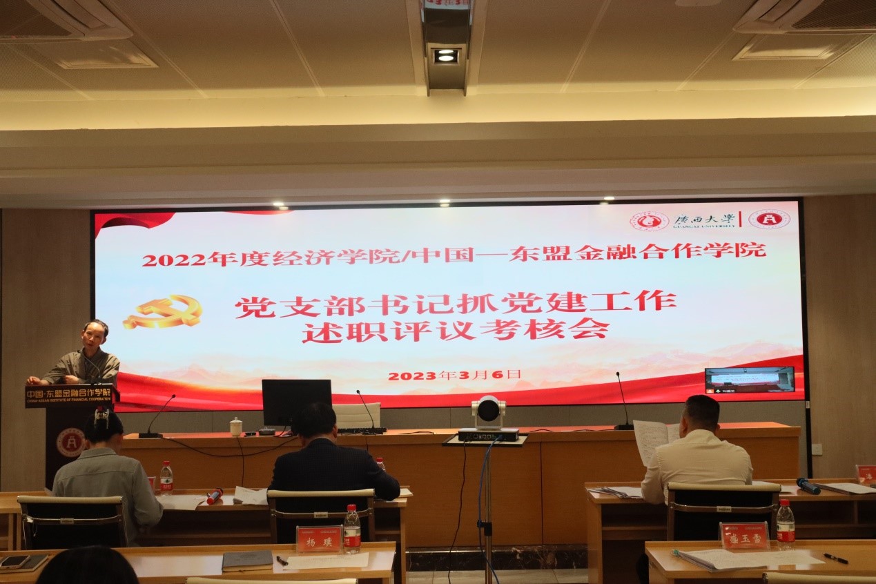 /中国-东盟金融合作学院以线上线下结合的方式在学院101会议室召开2022年度党支部书记抓党建工作述职评议考核会。学院党委委员、12个党支部书记和考评小组成员参加了本次述职会,会议由学院党委副书记陈卉娟主持。