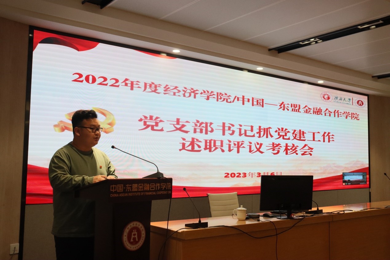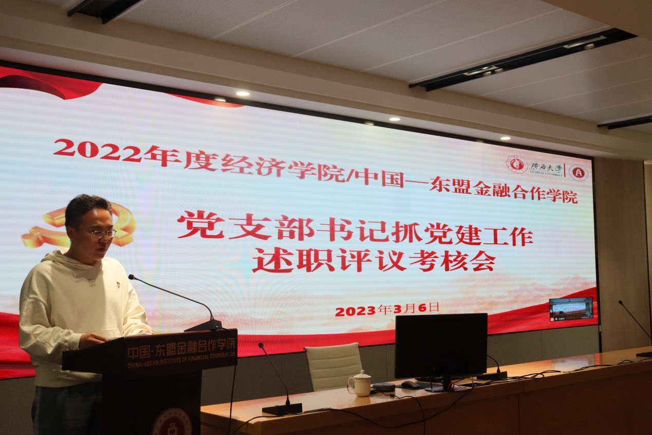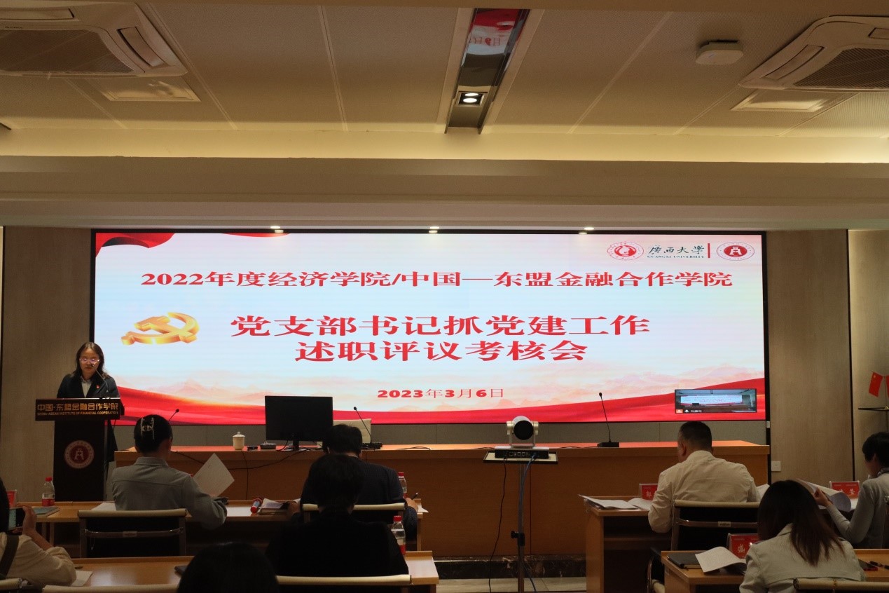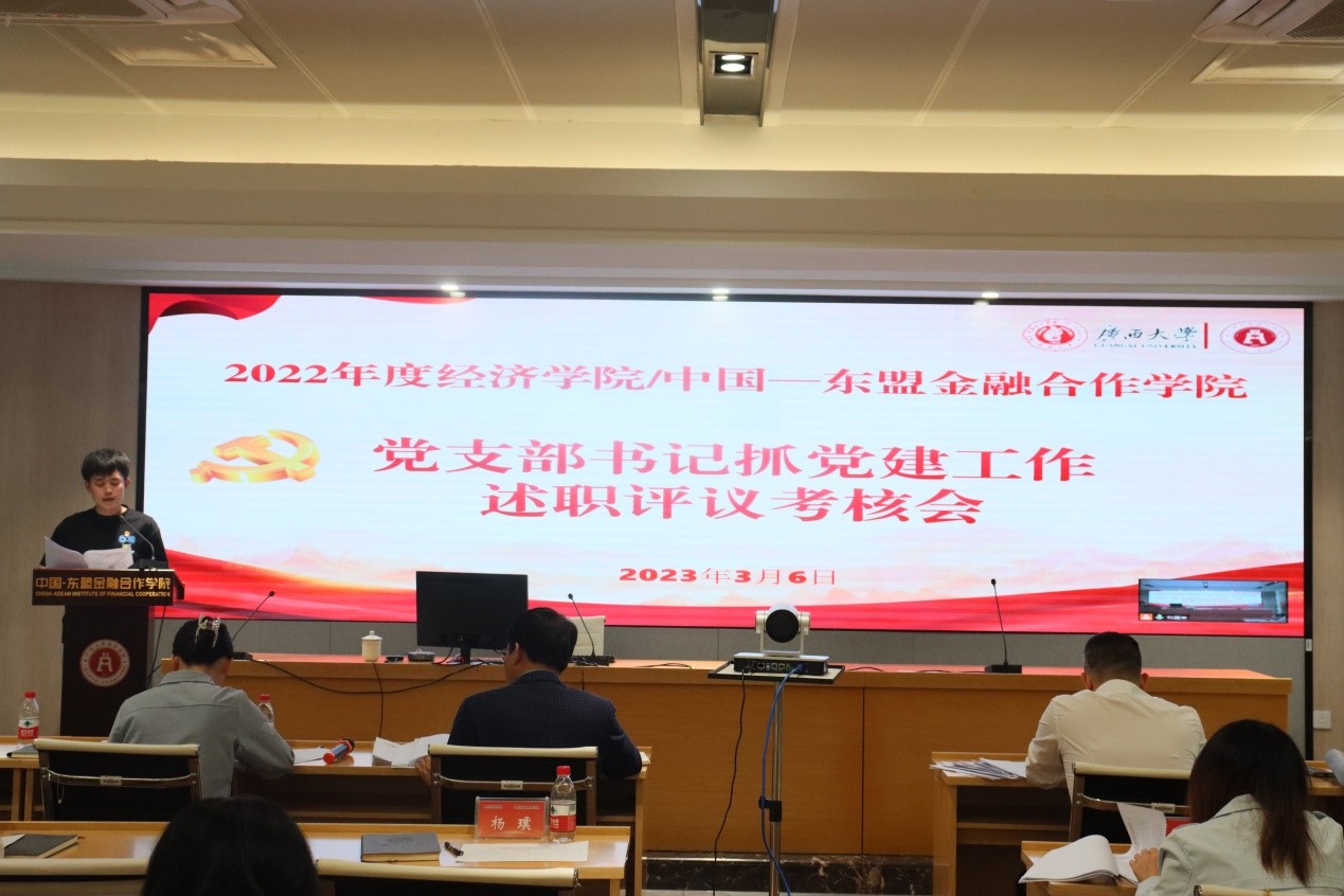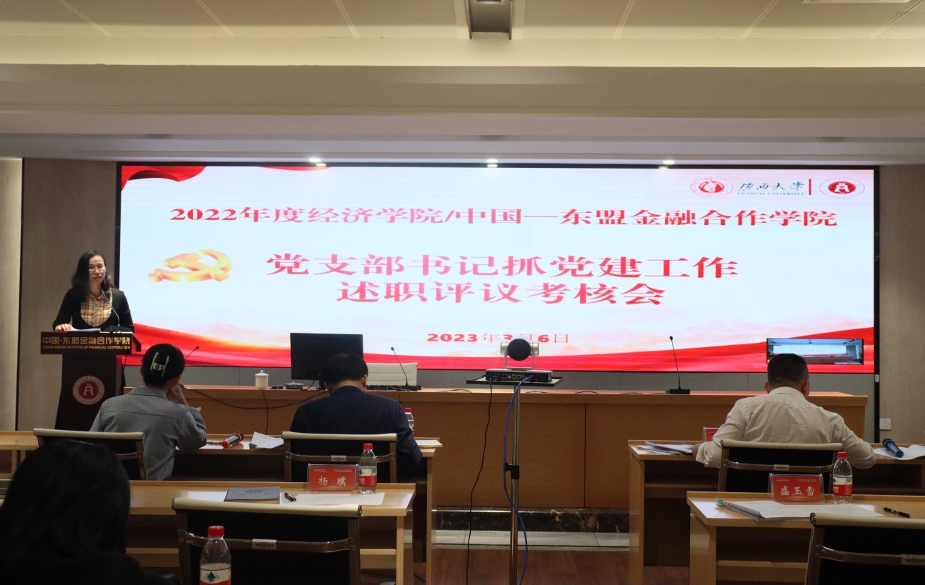 /中国-东盟金融合作学院以线上线下结合的方式在学院101会议室召开2022年度党支部书记抓党建工作述职评议考核会。学院党委委员、12个党支部书记和考评小组成员参加了本次述职会,会议由学院党委副书记陈卉娟主持。