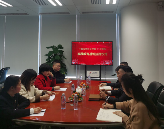 副院长谭春枝、金融与财政系主任刘骞文、经济学系主任郭南芸、副主任盛玉雪一行四人赴广发期货有限公司南宁分公司洽谈合作并举行校企共建实践教育基地挂牌仪式。广发期货有限公司南宁分公司总经理罗贤光、总监刘馨等参与座谈。
