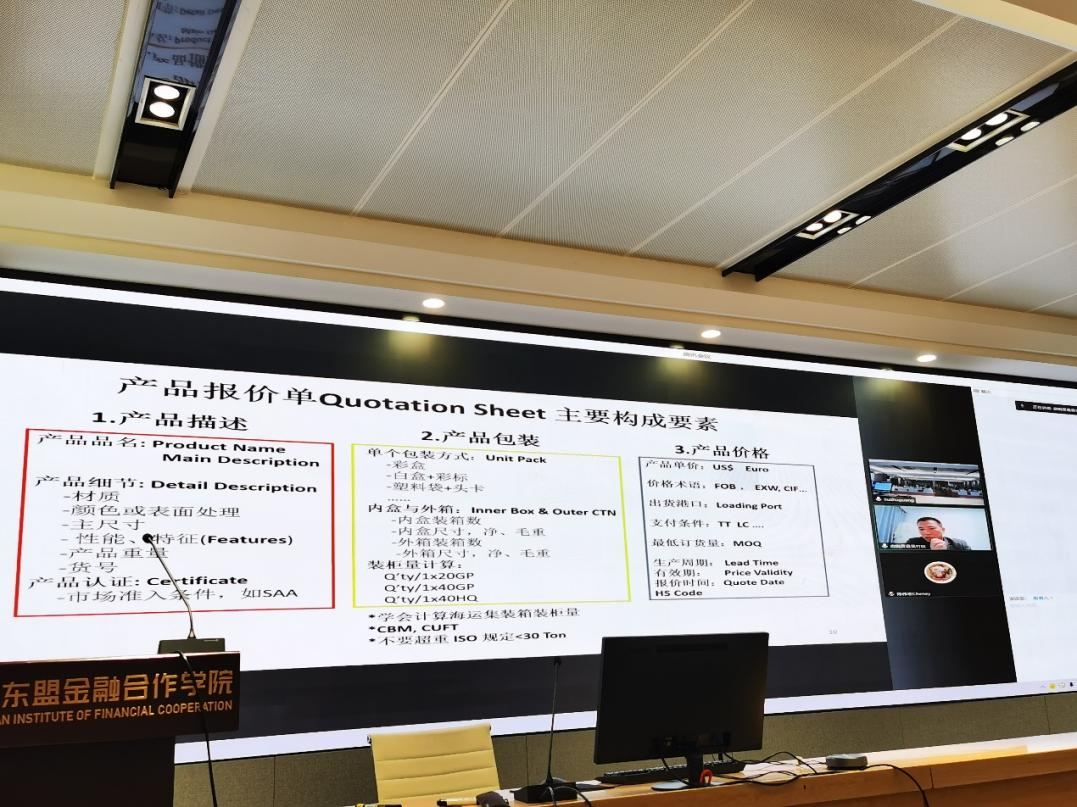 吴经理为大家详细介绍了国际贸易实务中产品报价单的主要构成,重点讲述还盘的注意事项,强调了还盘议价是一个极为重要的过程,要小心应对,永远不要情绪化;重点讲述产品的价值,跟竞争对手只讲客观事实,不要任意评价;遵从合作,谈判做到心中有数等国际贸易实务崇尚的准则。