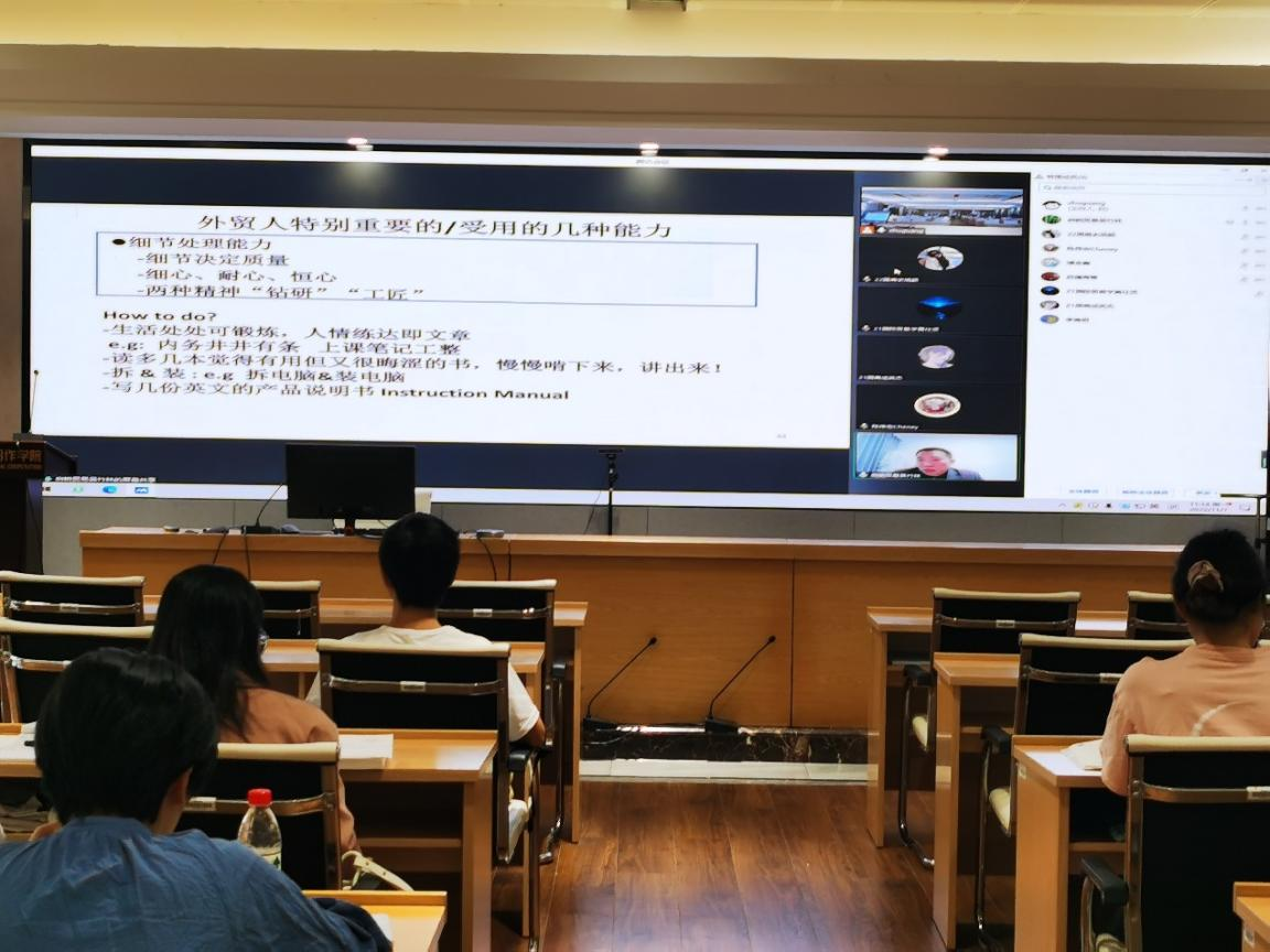《国际贸易实务》课堂开展《Export Business Case Study & Experience》讲座。讲座由国贸系主任刘主光教授主持,国际经济与贸易201班全体本科生积极参与课堂并与吴经理进行在线交流,国贸系教师与国际贸易学、国际商务专业研究生也积极参与线上听讲。