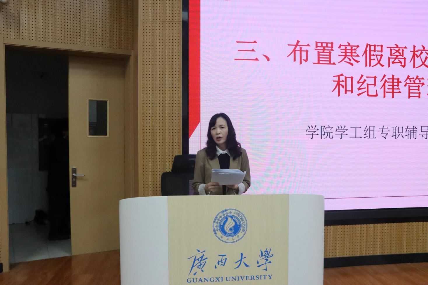 随后,学工组专职辅导员覃晓阳老师布置学生寒假离返校信息登记和纪律管理工作。根据麻豆瓜网