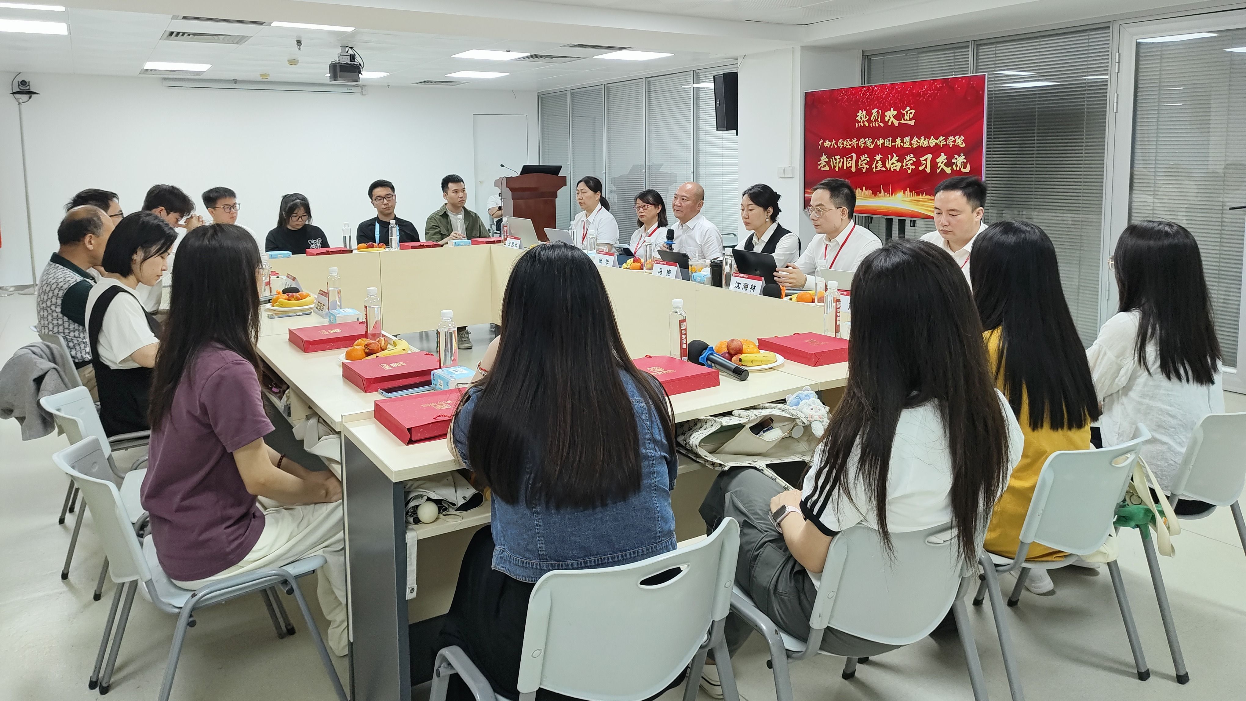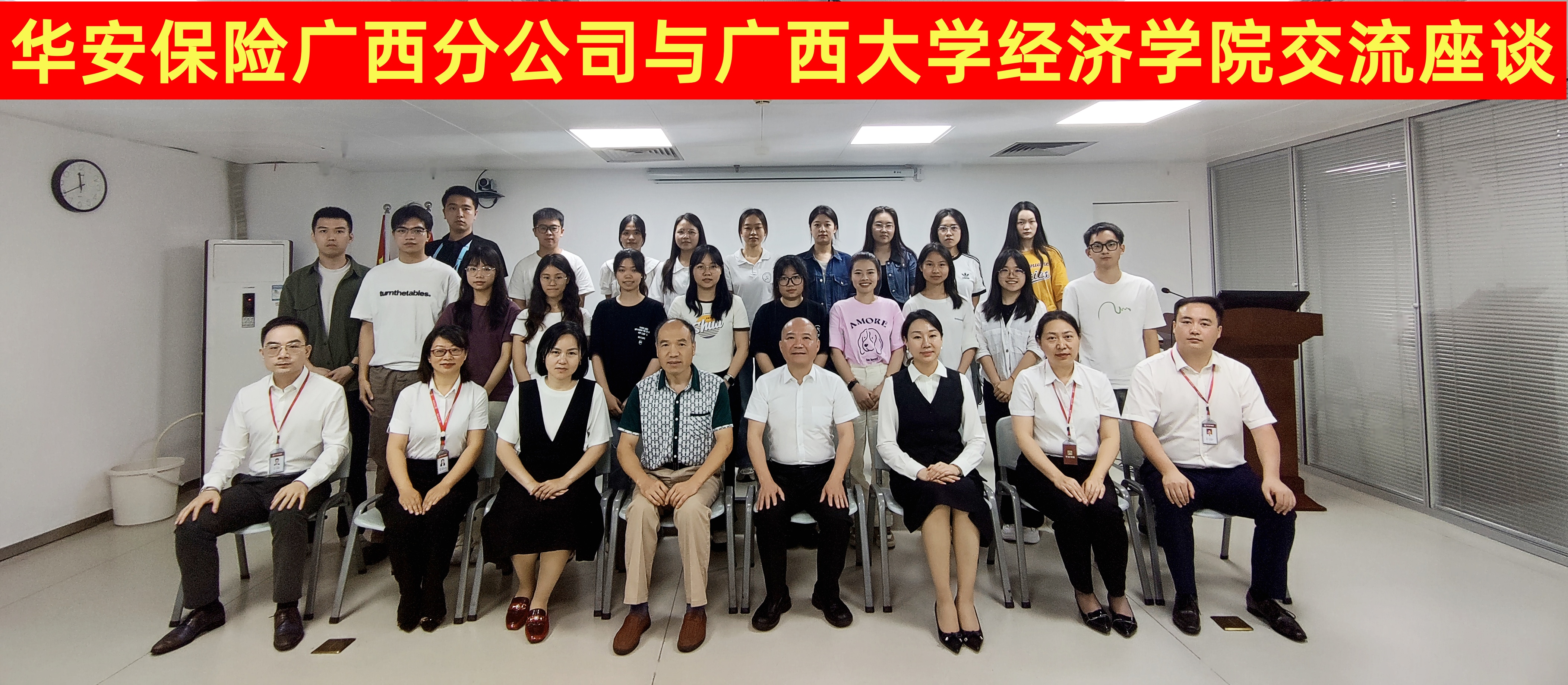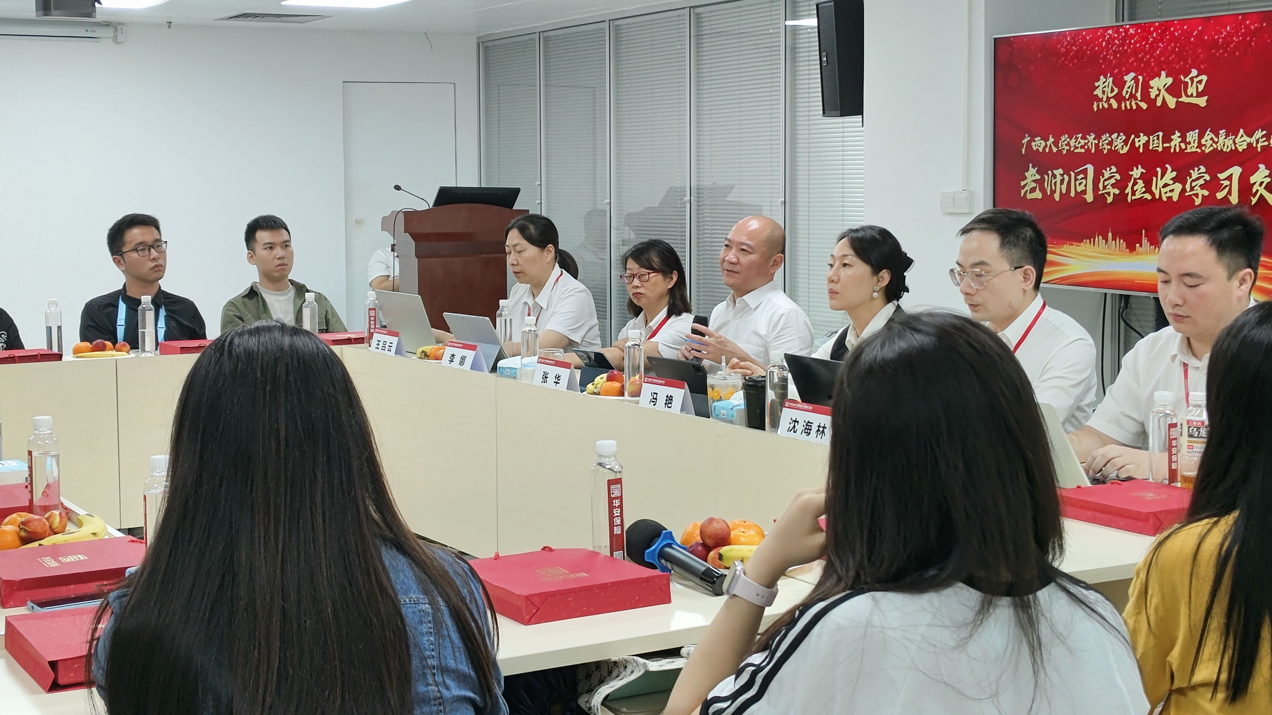 /中国—东盟金融合作学院唐金成教授、莫国莉副教授和2023级保险专硕全体同学一行到华安财险广西分公司交流学习。华安财险广西分公司总经理张华、副总经理冯艳、人力资源部经理王吕云、人身险部经理沈海林、创新业务部经理李娜、客户服务暨消费者权益保护部经理助理李旭出席本次交流会。
