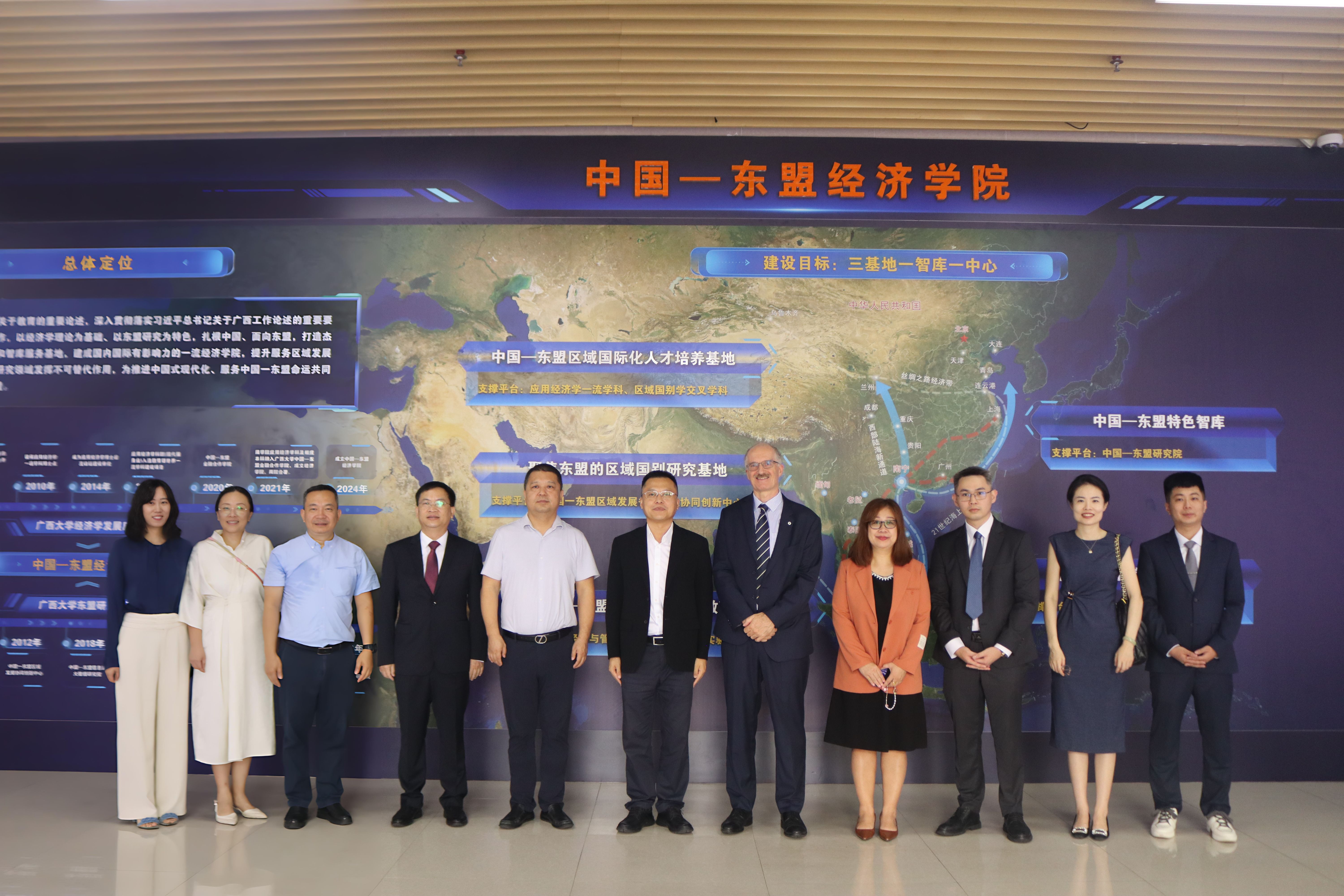 On September 17, 2025, David Fitzpatrick, Provost and CEO at the University of Nottingham Malaysia, led a delegation to visit the China-ASEAN School of Economics. Xia Guoen, Member of the Standing Committee of the Party Committee and Vice President of Guangxi University; Jiang Wei, Member of the Party Committee and Executive Deputy Secretary of China–ASEAN School of Economics, Guangxi University; and Gong Zheng, Vice Dean of China–ASEAN School of Economics, accompanied the visit.