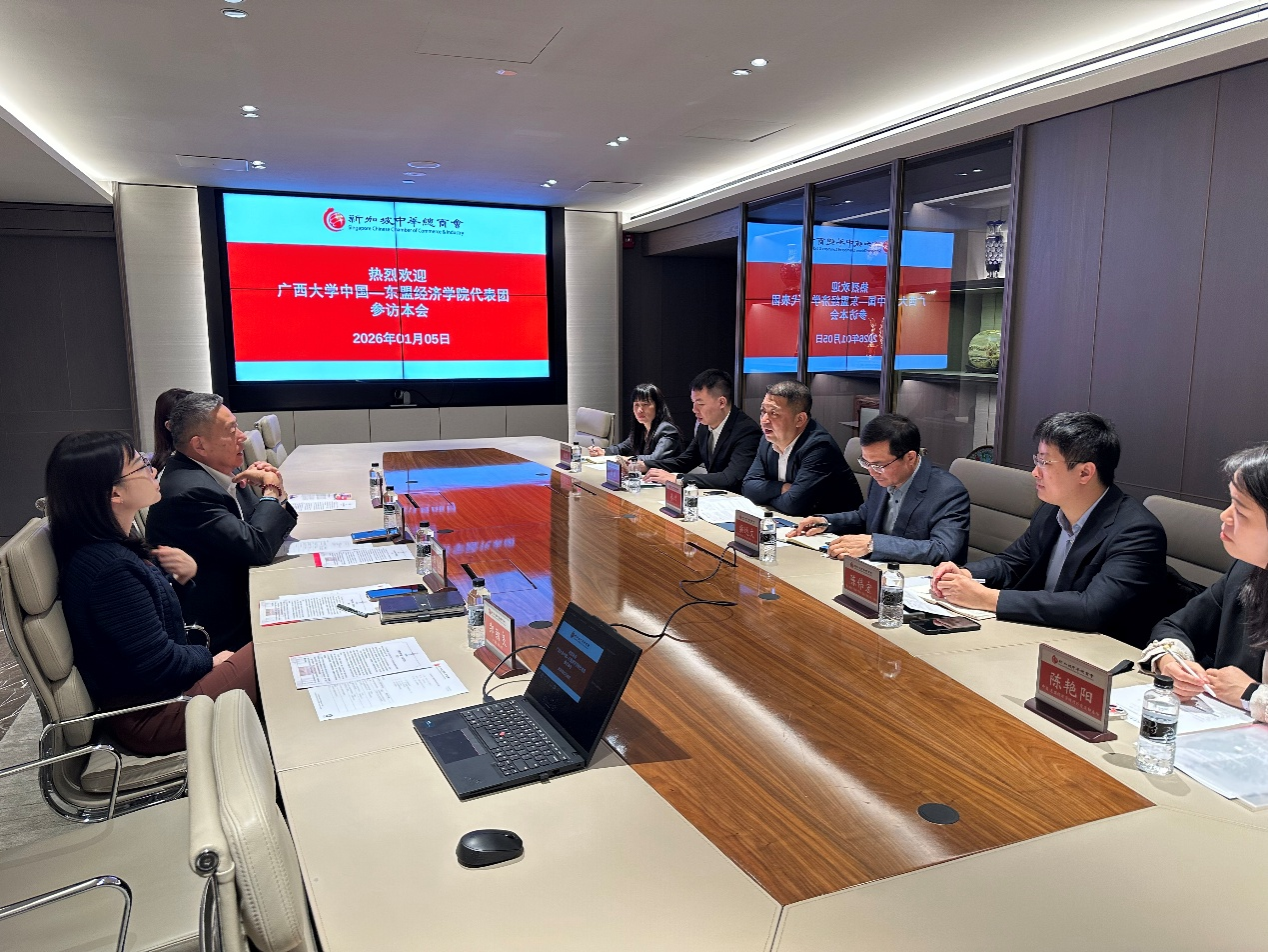 On the afternoon of January 5, the delegation visited the Singapore Chinese Chamber of Commerce and Industry. The delegation was warmly received by Mr. Bai Yibo, core director of the chamber. The two sides had in-depth discussions. Mr. Jiang Wei introduced the School's educational positioning for ASEAN, its research achievements in ASEAN, and the cultivation of international talents, expressing the School's willingness to fully leverage its disciplinary and geographical advantages to provide intellectual support, policy consultation, and high-end talent supply for Chinese enterprises in Singapore and ASEAN. Both sides agreed to establish a regular communication mechanism, deepen school-chamber and school-enterprise cooperation, and achieve resource sharing, complementary advantages, and mutual benefits.