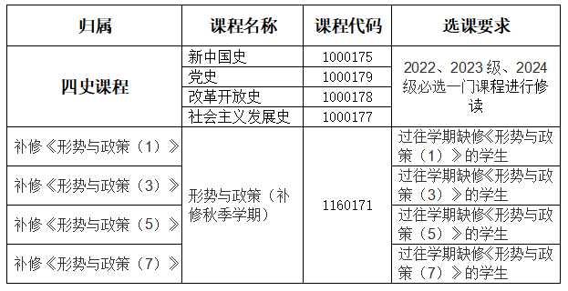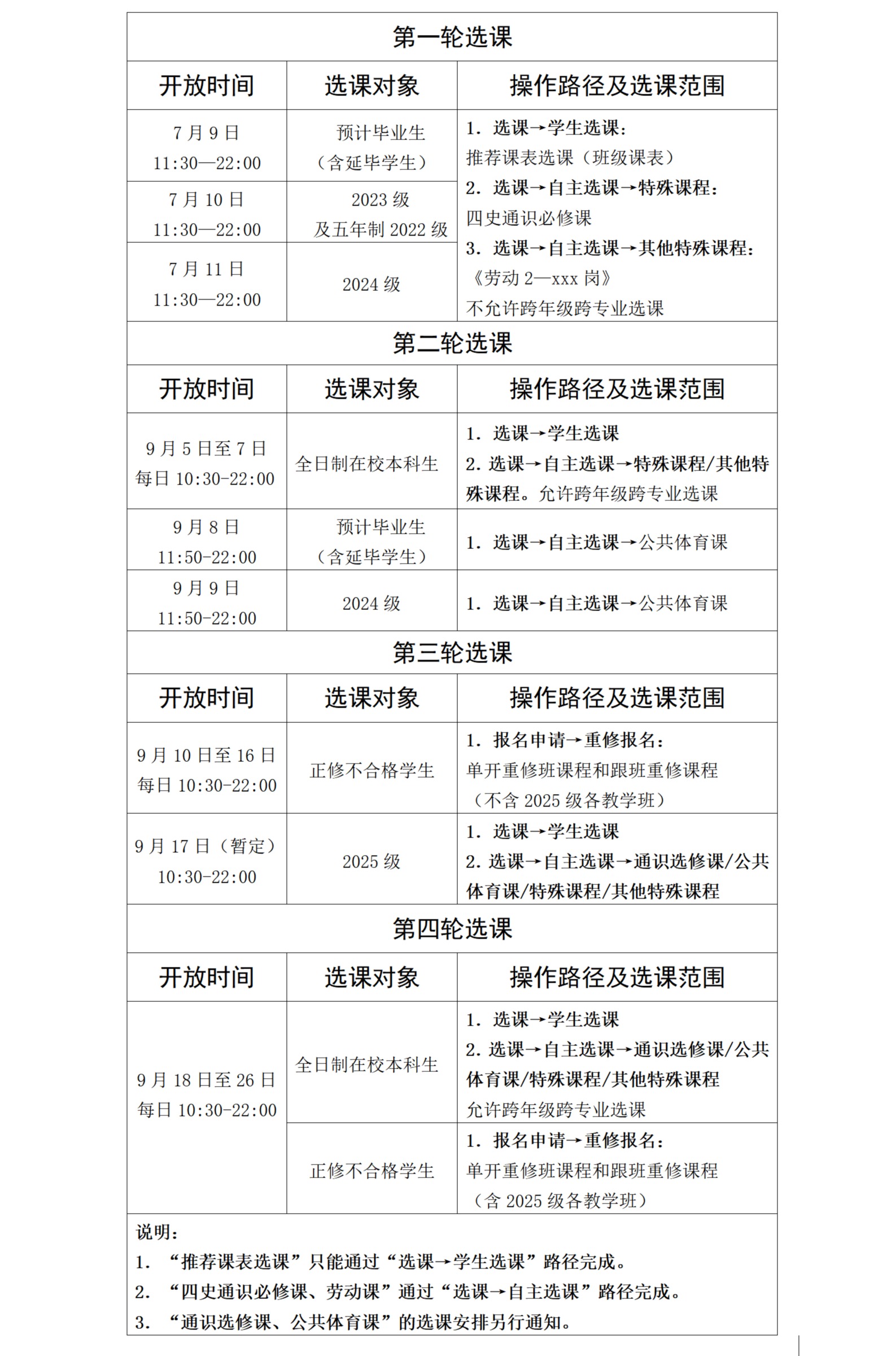 (二)2025级本科生选课安排另行通知。涉及新生年级开设课程的跨年级跨专业选课和重修选课,需要新生年级完成第一轮选课后再开放。