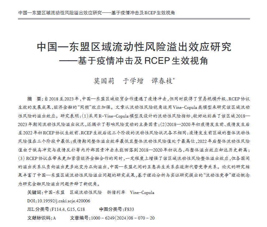 莫国莉副教授、2020级应用经济学硕士研究生于学增、谭春枝教授(通讯作者)合作的论文《中国—东盟区域流动性风险溢出效应研究——基于疫情冲击及RCEP生效视角》在期刊《南方经济》发表。
