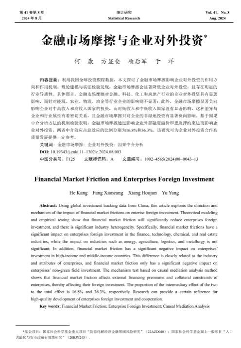 何康助理教授、华东师范大学经济与管理学院方显仓教授、广东金融学院金融与投资学院项后军教授、山东财经大学于洋老师合作的论文《金融市场摩擦与企业对外投资》在中文权威期刊《统计研究》发表。