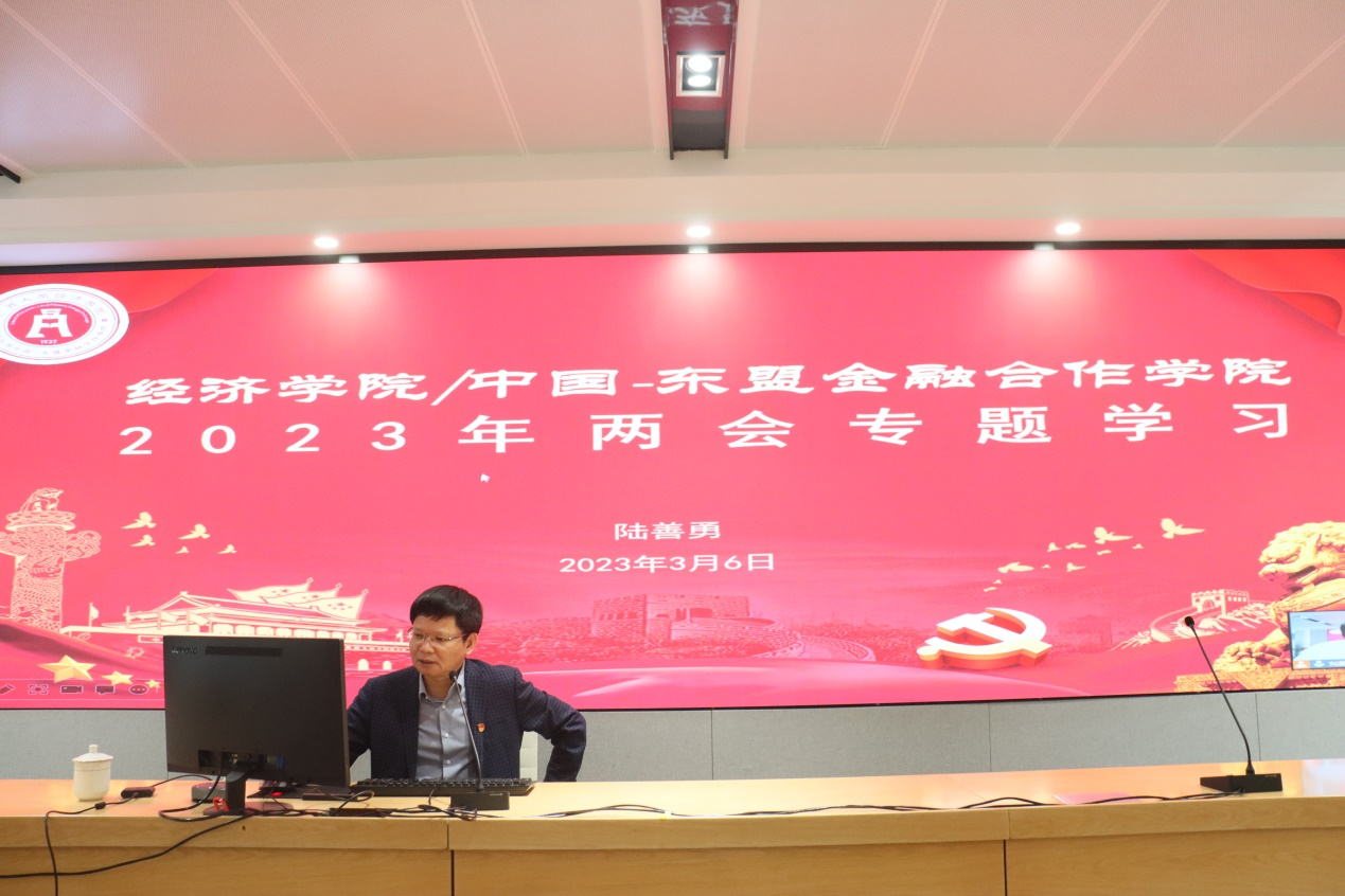 /中国-东盟金融合作学院党委理论学习中心组在学院101教室举办两会专题学习会,校党委委员、院党委书记陆善勇教授领学李克强总理作的2023年政府工作报告和习近平总书记参加江苏代表团审议时的讲话精神,学院党委委员、全体党支部书记参加学习并交流。