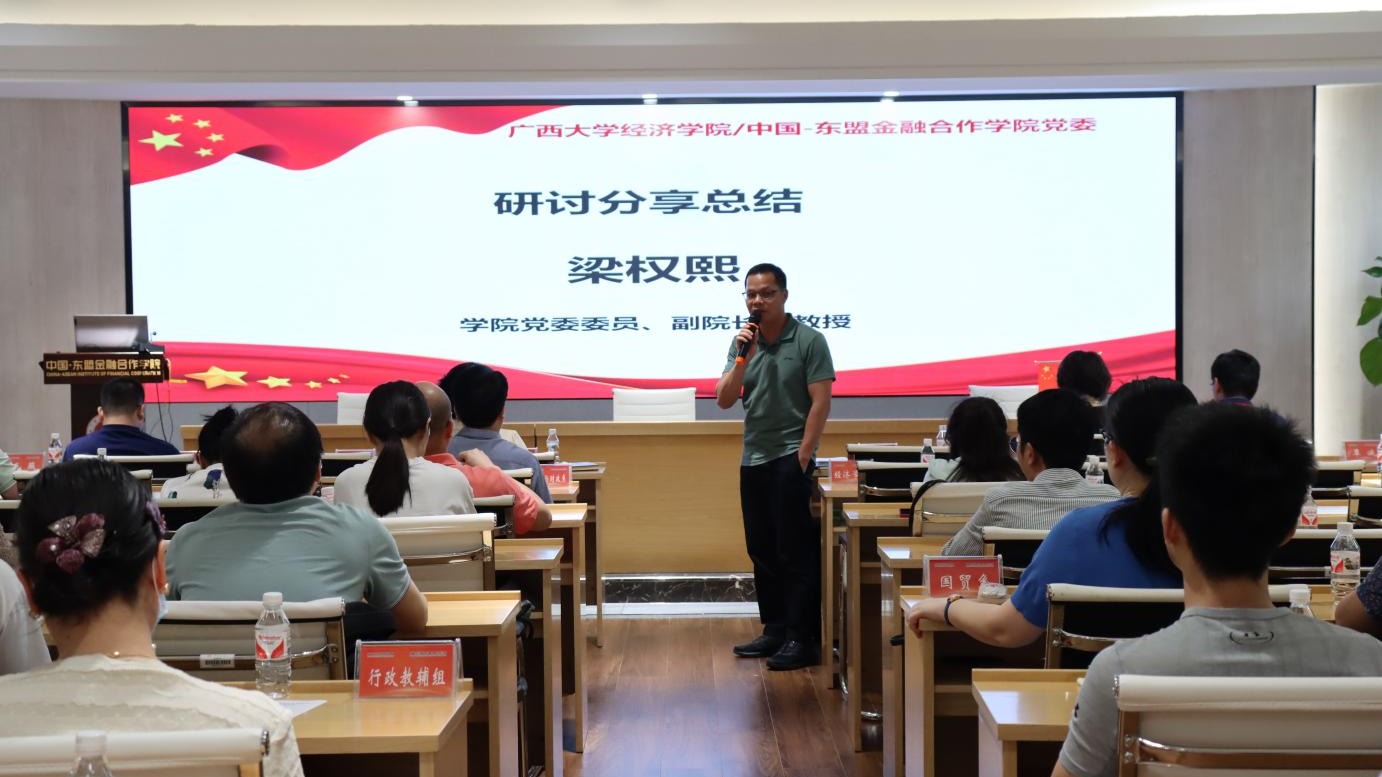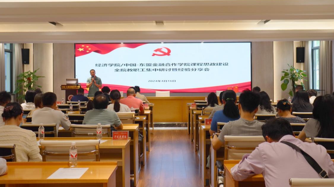 /中国-东盟金融合作学院党委在学院101会议室组织召开课程思政建设全院教职工集中研讨暨经验分享会。会议邀请谭春枝、郭南芸、张瑞纲三位获校级课程思政示范课立项的教师为全院教职工分享课程思政建设经验。学院党委领导班子成员、学院课程思政工作小组成员及全体教职工参加会议。会议由学院党委委员、副院长梁权熙教授主持。
