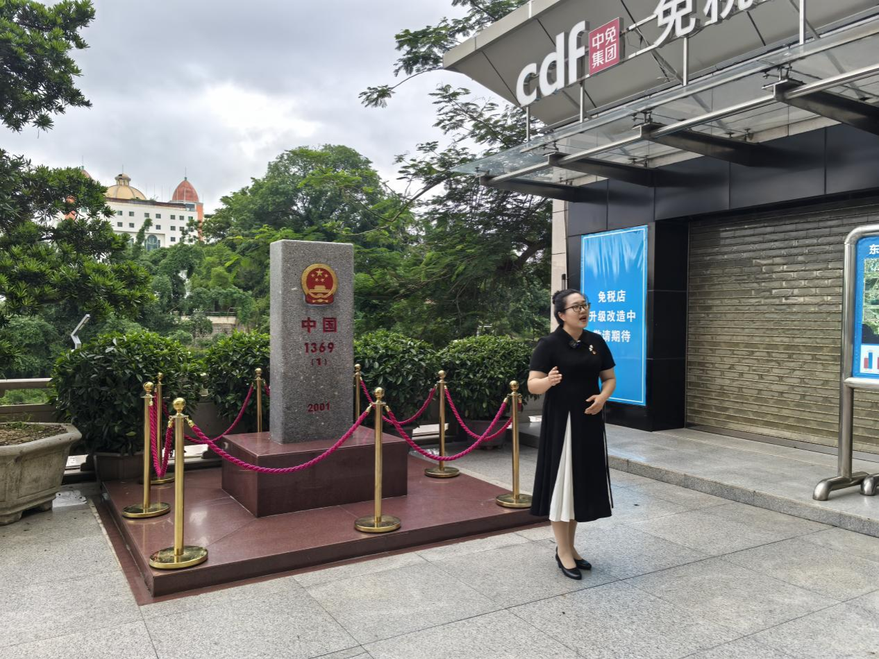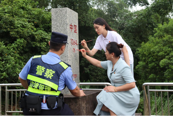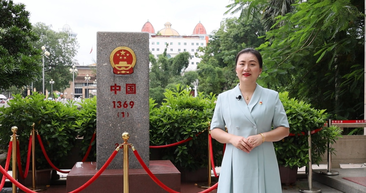 研究生支教团成员唐子涵站在东兴国门口岸旁的1369号界碑前,开讲《1369号界碑旁的生命直通车》:“今天的我们,既要守护国土,也要架起友谊之桥。通过“1369生命直通车”,移民管理警察与时间赛跑,为生命让行,全天候响应和抢救中越危急重病患者,8年来共救助680多名中外患者,赢得一片好评!”
