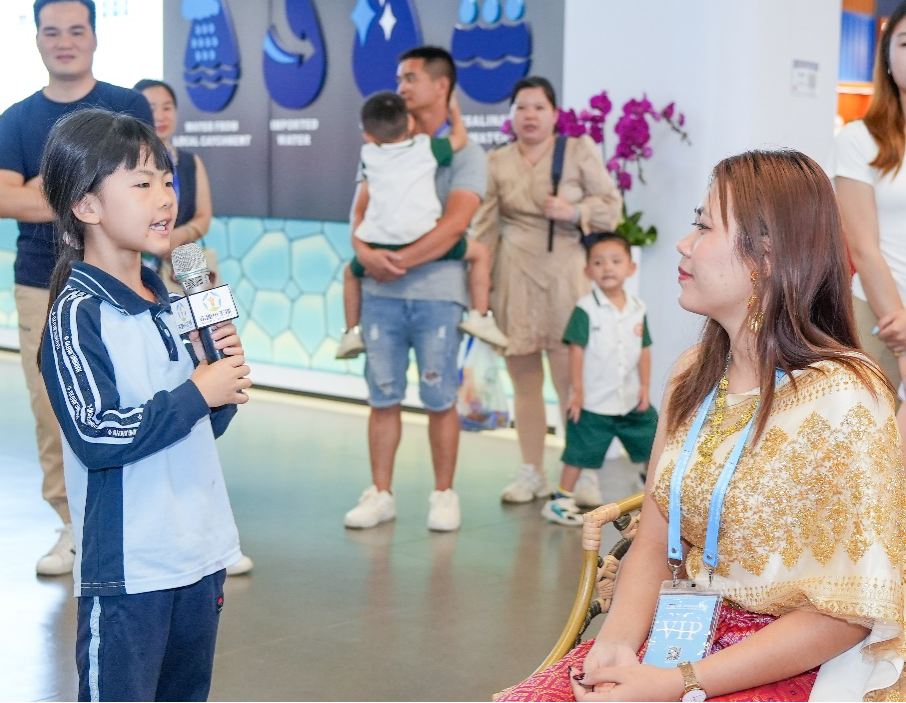 高佳恩、郭梓萱在中国—东盟特色商品汇聚中心广西馆与小学生互动