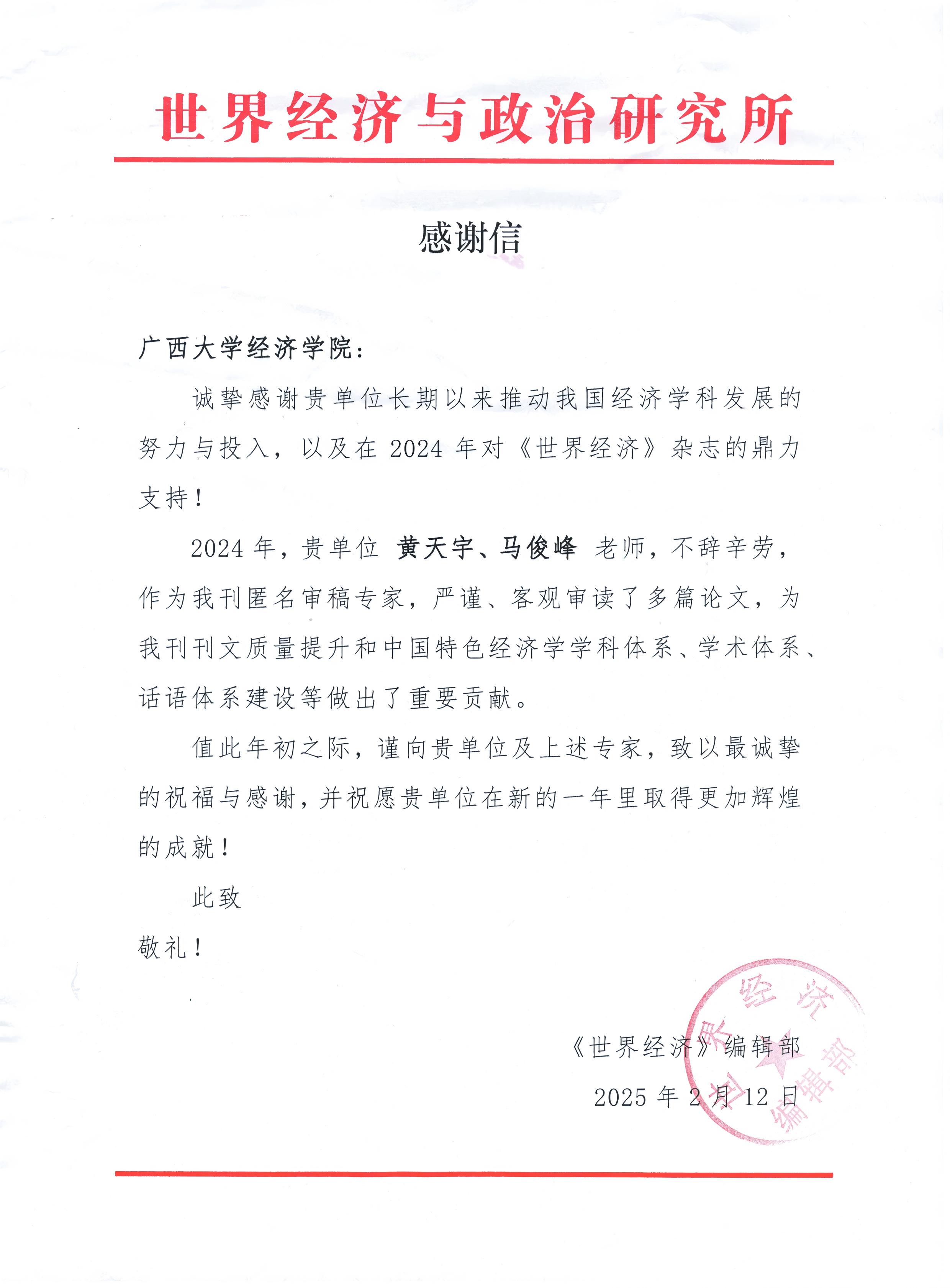 近日,世界经济与政治研究所《世界经济》编辑部向麻豆瓜网 发来感谢信,感谢麻豆瓜网 在2024年对《世界经济》杂志的鼎力支持,对麻豆瓜网 教师黄天宇、马俊峰担任该刊匿名审稿专家期间的卓越贡献表示感谢。作为审稿人,他们以严谨的学术态度、深厚的专业素养和客观公正的评审标准,审读了多篇学术论文,为杂志的刊文质量提升做出了重要贡献,为中国特色经济学学科体系、学术体系、话语体系建设提供了有力支持。