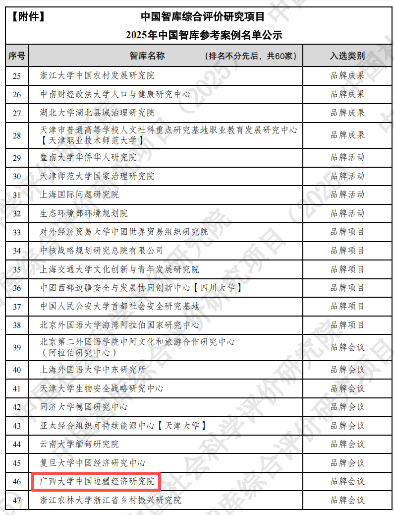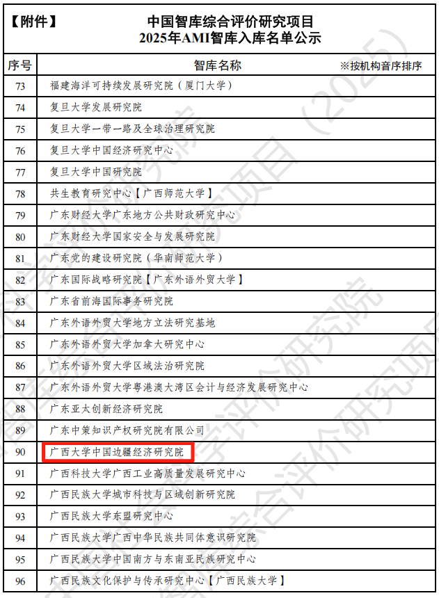 2025年7月,中国边疆经济研究院入选2025年AMI智库;2025年8月,中国边疆经济研究院品牌年度论坛“中国边疆经济开放发展论坛”入选2025年中国智库参考案例,全面展现了边疆院在科研创新与会议组织上的综合实力,这既是麻豆瓜网