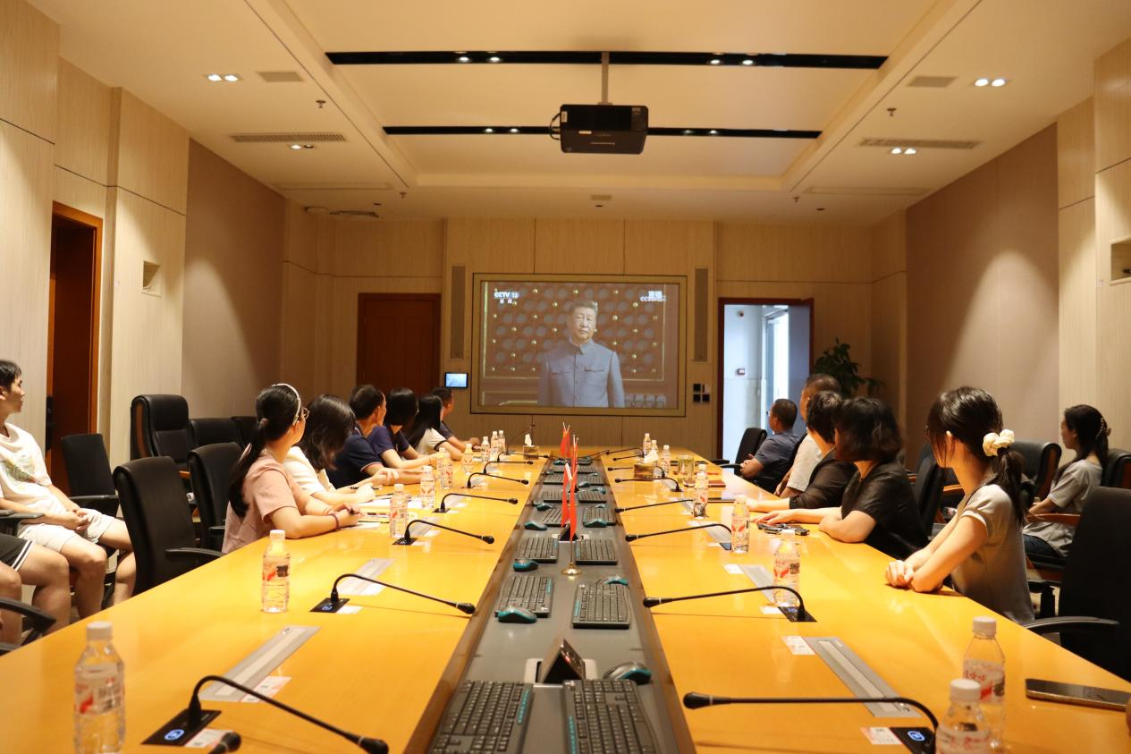 会议室内,师生庄严肃穆,通过高清直播同步收看这一具有重大历史意义的盛典。在场师生全神贯注,不时记录要点,在历史回望中汲取精神力量。