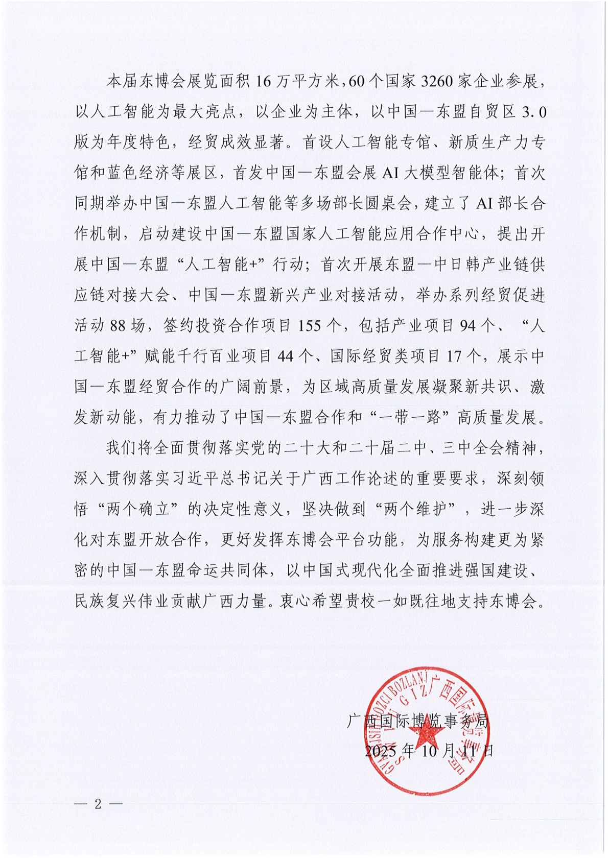 与广西国际博览事务局共同主办2025中国—东盟经贸合作对话活动,积极参与中国—东盟青年领军者成长计划等东博会重要活动,出色完成东博会对口接待、青年交流、翻译、研修班授课等任务,派出近百名优秀学生担任东博会志愿者。