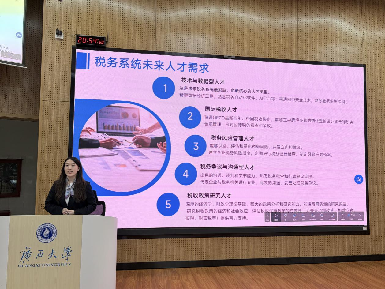 “传统税务人才的核心是会计、税法知识,这些依然是基础,但将来更需要的是能够利用这些知识进行分析、预测和决策的能力。”她鼓励同学们在校期间除了夯实财政学、税法等专业基础,还应主动学习Python等数据分析工具,了解信息系统,培养“税务+科技”的复合型能力。