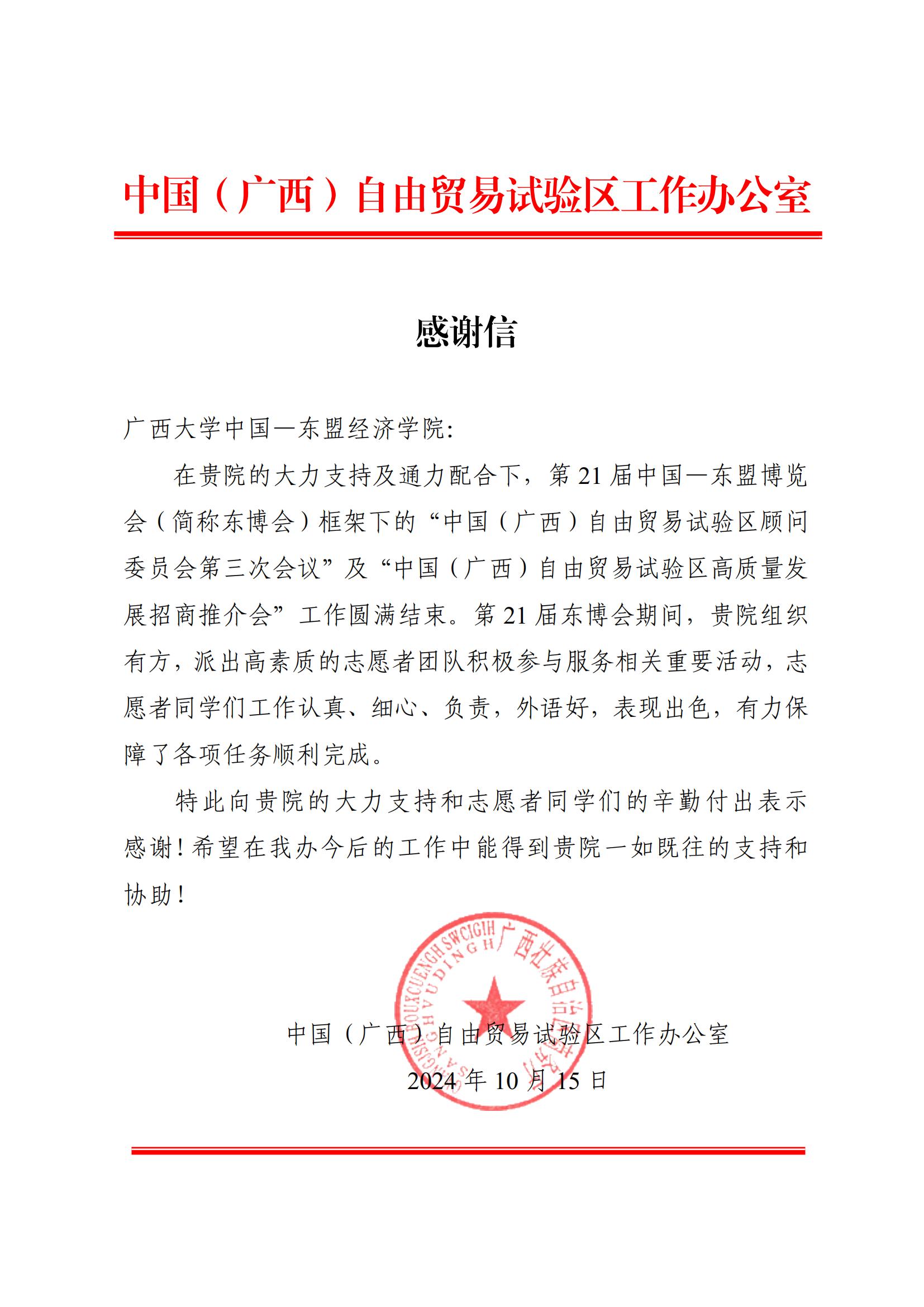 本院坚持“知行合一”的实践育人理念。五年来,累计组织寒暑假社会实践团队30余支,获校级重点项目8项,参与“扬帆计划”“返家乡”“三下乡”等实习实践学生800余人,推荐西部计划志愿者8人,获学校社会实践“优秀单位”荣誉。本院大力弘扬志愿精神,开展边疆经济学数据库建设、中国—东盟博览会和第一届学生(青年)运动会等志愿服务活动,收到中国(广西)自贸区工作办公室、广西国际博览事务局发来感谢信,志愿服务累计时长超3万小时,志愿者人次超3000人。广大青年在实践中深化了对边疆国情与东盟合作需求的认知,锤炼了跨文化沟通与实干能力,真正在服务国家战略、促进区域发展中挺膺担当,实现了专业所学与青春奉献的有机统一。