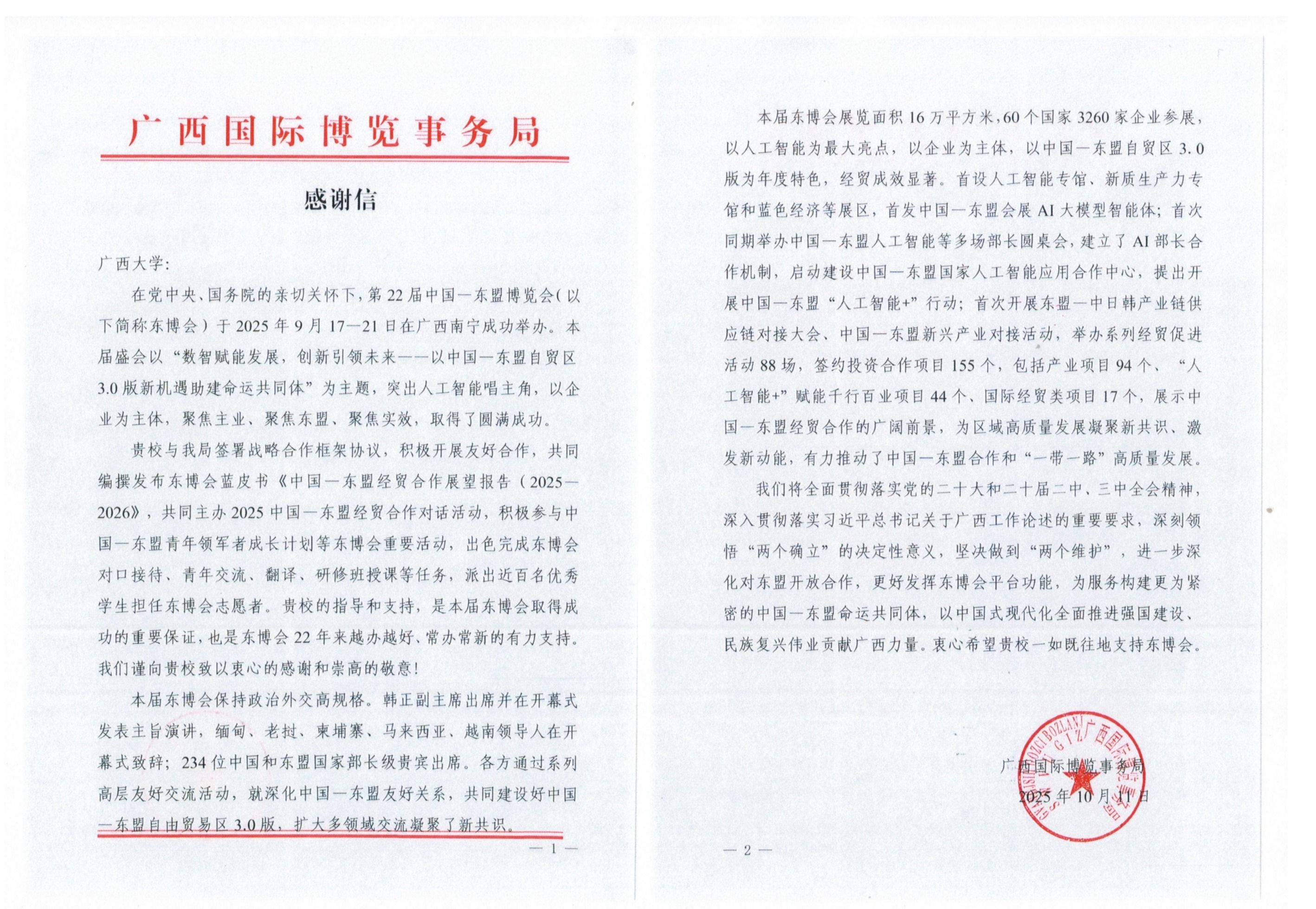 本院共青团工作始终坚持党的领导,牢牢把握政治方向。过去五年,校内外单位各级领导多次莅临指导,出席学院成立仪式和挂牌仪式、第22届中国—东盟博览会“2025年中国—东盟经贸合作对话活动”、“五四”青年表彰等重大活动并发表讲话,为青年成长把舵定向。上级专题听取工作汇报,对实践基地建设、青年人才培养、校友资源整合等领域作出具体指示;建立常态化的“师生面对面”交流机制,通过“和书记聊思想”和学生骨干培训等形式,积极回应青年成长成才的核心关切。这些精准的指引与深切的关怀,为本院团学工作注入了强大的发展动力,引领青年在推进中国式现代化、服务中国—东盟命运共同体和新时代壮美广西建设中挺膺担当。