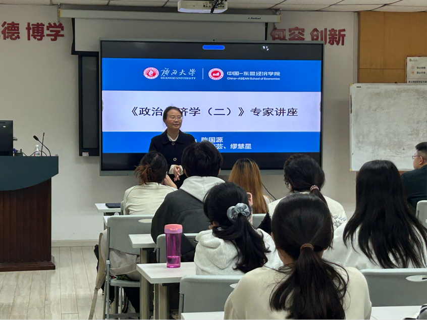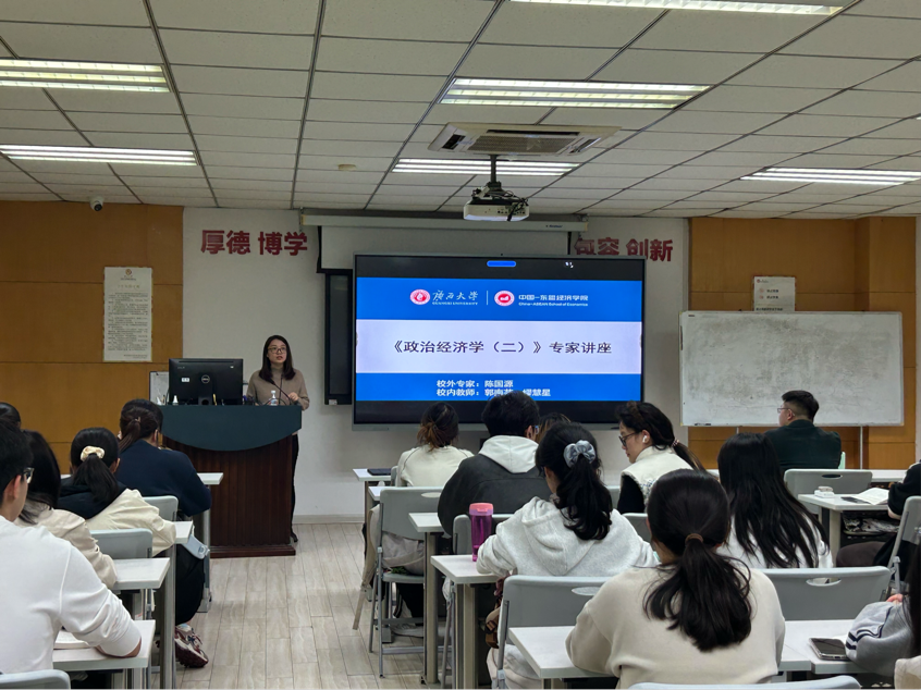 随着时代发展,深化产教融合,促进教育链、人才链与产业链、创新链有机衔接,已成为高校培养高素质创新人才的重要途径。为拓宽学生学术视野,洞察行业发展脉搏,将最鲜活的市场实践引入校园,2025年12月23日晚,经济学专业于MBA大楼613教室举办《政治经济学(二)》校企共授课程专家讲座,特邀南宁市青秀区直属国企广西南宁昇达资产投资有限公司副总经理陈国源围绕民营企业治理和民营经济发展作了题为“恒大公司治理失败的警示与反思”的讲座。讲座由任课教师缪慧星副教授主持,经济学系主任郭南芸共同出席,麻豆瓜网