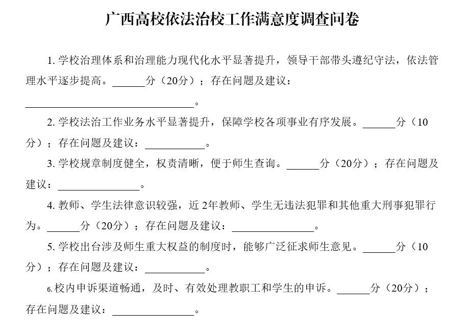 依法治校工作高水平发展,按照《自治区教育厅 自治区司法厅关于开展全区大中小学校依法治校达标建设和示范校创建评估工作的通知》 (桂教政法(2023)4号) 的部署和要求,需以网络问卷的形式开展依法治校工作满意度调查。