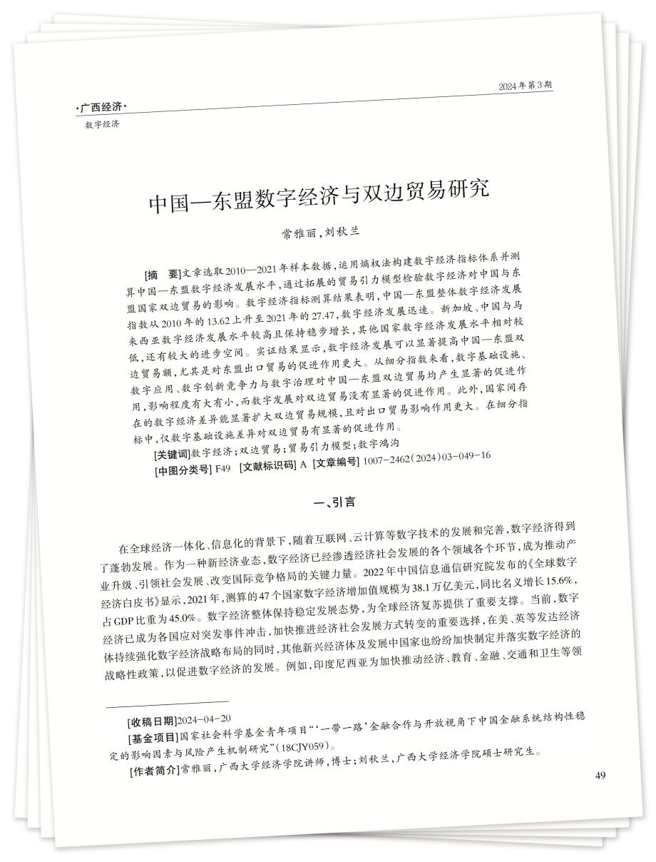 [摘 要]文章选取2010—2021年样本数据,运用熵权法构建数字经济指标体系并测算中国—东盟数字经济发展水平,通过拓展的贸易引力模型检验数字经济对中国与东盟国家双边贸易的影响。数字经济指标测算结果表明,中国—东盟整体数字经济发展指数从2010年的13.62上升至2021年的27.47,数字经济发展迅速。新加坡、中国与马来西亚数字经济发展水平较高且保持稳步增长,其他国家数字经济发展水平相对较低,还有较大的进步空间。实证结果显示,数字经济发展可以显著提高中国—东盟双边贸易额,尤其是对东盟出口贸易的促进作用更大。从细分指数来看,数字基础设施、数字应用、数字创新竞争力与数字治理对中国—东盟双边贸易均产生显著的促进作用,影响程度有大有小,而数字发展对双边贸易没有显著的促进作用。此外,国家间存在的数字经济差异能显著扩大双边贸易规模,且对出口贸易影响作用更大。在细分指标中,仅数字基础设施差异对双边贸易有显著的促进作用。