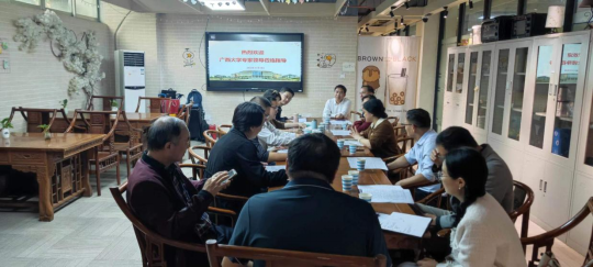 讲座结束后,刘主光教授和张林教授分别率团继续开展对口帮扶工作。刘主光教授带领国际商务硕士生导师团队与梧州学院管理学院、商学院领导和老师以座谈会方式开展交流。在座谈会上,刘主光教授介绍了《梧州学院国际商务学位点特色培育与建设》的对口支援学科建设项目的相关内容,包括支援建设的背景、指标任务以及工作对接方式。随后,导师团队围绕《梧州学院国际商务硕士专业学位硕士授权点申报书》与《梧州学院国际商务专业硕士学位培养方案》进行了充分交流与研讨,为梧州学院国际商务硕士学位点建设提出了系列针对性的修改建议。